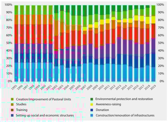 As for actions, defined herein as the means to achieve the objectives, we identified eight action types (Table 2). Five are focused on creating or improving social structures and behavior: setting up social and economic structures, creation/improvement of pastoral units, training, studies, and awareness-raising. Two types of actions are related to the distribution of material goods: construction/renovation of infrastructures and donations. Finally, one action type is directly linked to the environment: environmental protection and restoration.