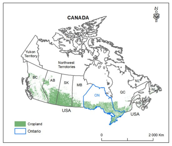 A recent development in digital soil mapping includes the use of remotely sensed covariates and machine learning techniques to study space-time variation of SOC stocks []. Because of its importance for spatial prediction of SOC in topsoil, these techniques could play a major role in LUCI implementation. The Canadian Annual Crop Inventory information published cropland cover (i.e., shown in Figure 1) can be of benefit LUCI implementation. We believe that a non-spatially explicit approach can impose limits on properly defining cropland areas and conversions between other land use areas and cropland. This has been acknowledged, for instance, in Australia’s most recent NIR where planned improvements are underway to develop a fully spatially explicit time series of land-use maps to apply land representation to all land-uses. Such improvements would enable reporting of separate activity data and emissions estimates for all conversion categories.