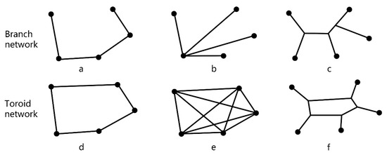 In 1989, Helmond pointed out that common network forms are divided into branch networks and ring networks, and listed six specific network form diagrams (Figure 2), which represent different network forms, respectively: the branch networks are a, b, and c; while the rings networks are d, e, and f. When using the graph theory method to plan a green space ecological network, the first concern is efficiency, which is usually defined by “cost to use” and “cost to builder” [46], as cost balance is an important framework to determine the network spatial pattern. Network a is the most basic of all networks; network b is a branch network, which belongs to the network with the lowest cost to use, and its “flow” flows to other nodes through a central node to redistribute the combination; network c is the network with the lowest cost to builder, and all nodes in the network are the end points. Ring networks are more complex and form closed loops; network d is the most basic kind of ring network; network e has the lowest cost to use, and each node is connected to each other; network f reflects the best balance between cost to use and cost to builder [47]. The above common network types can form various network models under different targets.