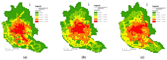 Urbanization intensity in Fuzhou (street global integration: (a) Urbanization intensity in 2000; (b) Urbanization intensity in 2010; (c) Urbanization intensity in 2021. Red represents the highest level of integration; green represents the lowest.