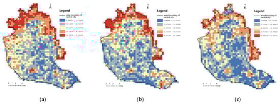 Map of LPI change in the central area of Fuzhou City: (a) landscape patch index of 2000; (b) landscape patch index of 2010; (c) landscape patch index of 2021. Red is the high LPI value, blue is the low LPI value.