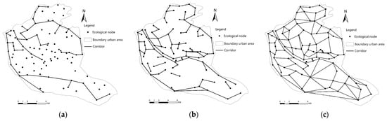 Thirdly, based on network II, the common network f was taken as a model to balance the contradictions among the many issues. On the basis of considering the node distance factor, this study tried to avoid corridor crossing, and used potential ecological corridors to connect all possible ecological nodes to form network III (Figure 10c), which has higher complexity. The ring structure can enable organisms in the network to interact with each other in matter, information, and energy.