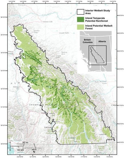 Additionally, the IWB has not been assessed for its conservation status and potential contributions to Canada’s commitments. Compared to temperate rainforests on the BC coast (i.e., Great Bear rainforest) that have received most of the provincial conservation attention, IWB primary forests have received scant attention and are widely exploited [,,,] in the absence of contemporary conservation planning. These interior forests support globally significant biodiversity such as extraordinary lichen richness [,], contain substantial carbon stocks [,], and represent one of only three inland temperate rainforests (ITR) on Earth (Russian Far East and Southern Siberia are the others []).