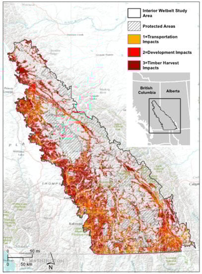 Various approaches have been developed for assessing the conservation status of imperiled ecosystems like primary forests, including global hotspots [], WWF Global 200 ecoregions [], roadless areas [], intact/wilderness areas [,], and Key Biodiversity Areas []. While these approaches all provide useful perspectives and highlight important attributes, they are not comprehensive enough for assigning status rankings to our study area—the Interior Wetbelt (IWB) of British Columbia (BC), Canada—a large (~16.46M ha) mainly forested bioregion containing portions of two WWF ecoregions and several biogeoclimatic subzones under intense development []. The IWB has not been identified as a hotspot or Key Biodiversity Area to date, although efforts to identify the latter in Canada are at an early stage. Further, there are benefits in applying an international assessment standard that can be compared with any other region, rather than using different national or sub-national methods. The IUCN method has only recently been finalized with guidelines for applying the RLE criteria [] and our study area represents a test case.