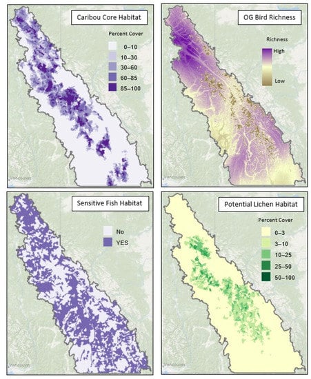 A published dataset on potential lichen habitat [] provided criteria for identifying the wettest and oldest Interior Cedar Hemlock forests (>250 years old) as high-quality lichen habitats within the BC Vegetation Resources Inventory. Bird species (n = 28, Supplementary File S1) that are likely to be associated with old-growth forest were identified by Birds Canada using data and distribution models from the Atlas of Breeding Birds of British Columbia, 2008–2012 (Table S1). Importantly, the bird distribution models combine topographic factors (e.g., slope, aspect, elevation, latitude and longitude) with species detections and survey effort information (number of hours) to predict the probability of observing for a species after 20 h of survey effort within a 10-km cell (an “Atlas Square”—the unit of measure in the British Columbia Atlas—in which participants were asked to complete 20 h of surveying for birds). A Generalized Additive Model (GAM) was used to fit the model across the entire land area of BC. These resulting Probability of Observation (“PObs”) raster layers can be thought of as annotated range maps, depicting not only the range of a species but also the likelihood of finding it within a given part of its range after a standardized search period. The models are therefore sensitive to the particular characteristics and requirements of each species (e.g., rare versus abundant; localized versus widespread; low versus high elevation, etc.), making it possible to combine guilds of species into a single map depicting the overlap of all species. Additionally, the layer for fish species (n = 6, Supplementary File S1) sensitive to human disturbances was obtained from a report by the British Columbia Ministry of Environment and Climate Change Strategy with data on their presence in each watershed obtained from the BC Conservation Data Centre (Table S1). The area of potential habitat for woodland caribou has been identified by Environment Canada [] (Supplementary File S1, Table S1). Core caribou habitat is identified as possessing ecological conditions necessary for populations of Southern Mountain Caribou to carry out life processes, including overwinter survival and reproduction [].