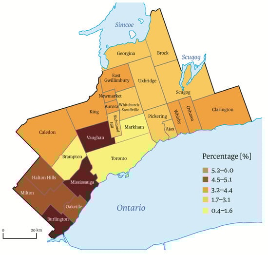 Figure 1 shows the percentage of Polish people in the Greater Toronto Area in relation to the total population of the entire area in 2016.