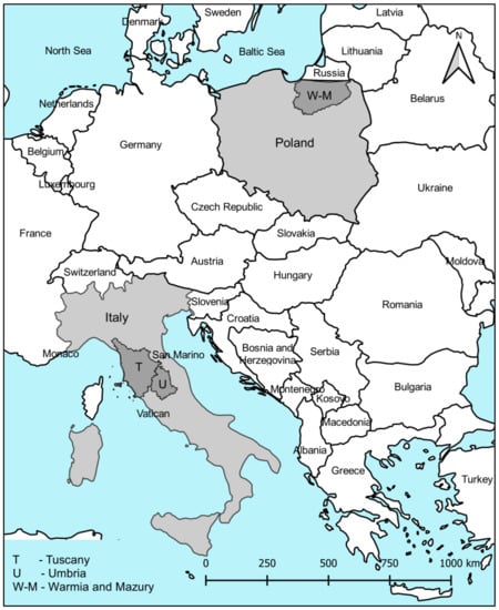 The study areas were small towns, which are Cittaslow members, in the Italian regions of Tuscany and Umbria, and the Polish region of Warmia and Mazury (Figure 1).