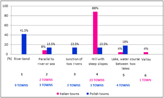 - Founding date—iconographic sources and an analysis of the literature relating to the history of Italian towns [56,57]. Polish towns were evaluated mainly by reviewing German-language literature and iconographic sources dating back to the 19th century [58,59]. The aim of the analysis was to identify differences in the spatial layout of the examined towns and to determine possible correlations between a town’s founding date and its urban layout (Table 1).
