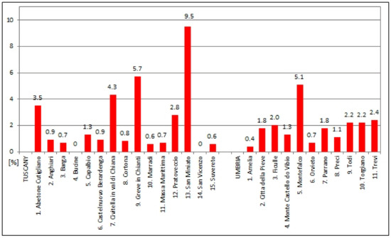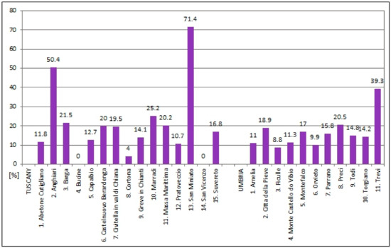 Tuscan and Umbrian towns are much older than their Polish counterparts. Some Italian towns were established in Roman times, and they are regarded as the cradles of European civilization [42]. The founding dates of some towns cannot be determined accurately due to the turbulent history of the Italian peninsula. Small settlements and Roman military camps were transformed into towns that were destroyed and reconstructed on numerous occasions over the centuries. Other towns were built as part of the urbanization effort of the Roman Empire [43,44]. Topographic features and other environmental factors significantly influenced the spatial structure of Italian towns, most of which have a highly irregular street pattern [45]. However, these factors have little bearing on the preserved urban fabric which dates back to later periods in history. The present size and population of Italian towns is unrelated to topographic features [46]. The territorial reach of Italian towns continued to expand as their economies grew in successive centuries, but their original layout has been preserved to this day. The study covered 15 towns in Tuscany and 11 towns in Umbria: