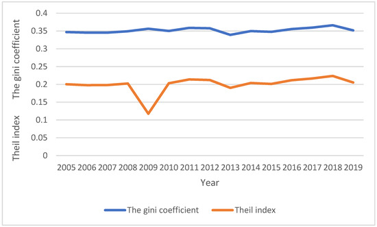 Since the founding of New China, Chinese farmers have experienced changes in farmland, agricultural management and farmland property rights systems. With the implementation of the rural revitalization strategy, the development of urban and rural areas has been coordinated, reforms have been comprehensively deepened, and farmers’ incomes have continued to increase. However, this increase in income has also been accompanied by a continuous expansion of the income gap within rural areas. The “Report on the Development of Rural Households in China (2018)” posited that rural household income inequality is rising in China. The Gini coefficient increased from 0.45 in 2011 to 0.535 in 2017, significantly higher than the internationally recognized warning line of 0.4 [1]. Figure 1 shows the Gini coefficient and Theil index estimated from quintile data of the per capita disposable income of rural households. These data came from the “China Yearbook of Household Survey” from 2005–2019.