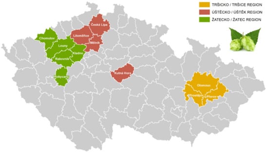 In Czechia, there is everything that beer production requires. Hop, malt and water are, in addition to yeast, the three most important ingredients for beer production. In addition, all these ingredients are found here in sufficient quantity and required quality. Hop is grown in only a few places in Czechia, due to its susceptibility to soil quality. The total area of hop fields in 2019 in Czechia was about 5003 hectares with a total final production of 7145 tons. The vast majority of hop fields were located in areas around Žatec, Tršice or Úštěc (see Figure 1). The Czech hop represents only about 7% of the world market in terms of the volume of its production, but it is one of the best, and Žatecký poloraný červeňák is a big concept in the world of brewing [3].