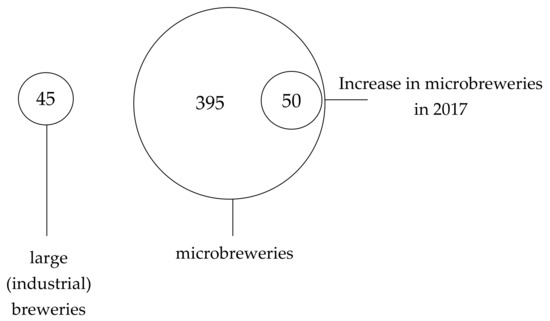 The reasons leading to the ever-increasing number of microbreweries in Czechia are various, i.e., market concentration, the percentage of the total population made up of the 25–39 years age group, and the rising share of domestic beer consumption in cans [43]. However, the role of microbreweries in contrasting with unified “euro beers” from the largest industrial producers cannot be overlooked. They create a colorful environment with new beer styles and various festivals with a brewing theme.