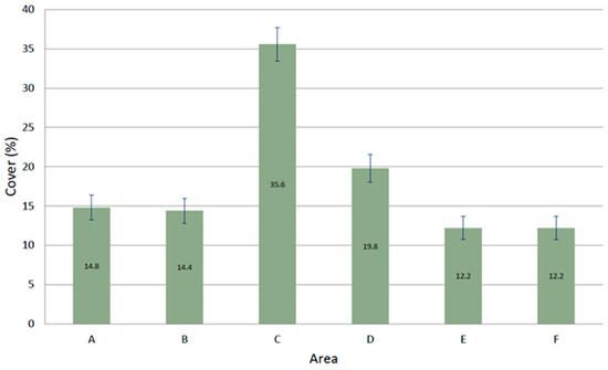 The percentage of tree cover in the six areas are given in Figure 2. Area E and F have the lowest coverage of 12.2 ± 1.46%, while the range of tree cover in the six study areas is between 12.2 ± 1.46% and 35.6 ± 2.14%. The lowest value is higher than in a previous study using i-Tree Canopy in Bristol, which found a value of 10% tree cover in the city center in 2018 [51]. This difference is due to the fact that the Bristol Tree Canopy Cover Survey in 2018 [51] assessed each area according to city council wards, e.g., Bristol Central was calculated using the total area of 223.14 ha with a tree canopy of 10.0 ± 1.62% using i-Tree Canopy and a tree canopy of 6.5% using i-Tree Eco. Furthermore, the UK tree cover, in general, was found to be lower than in other European and American cities [52]. Doick et al. [53] suggest that UK towns and cities strive to achieve a 20% tree canopy cover as a minimum standard while towns and cities with at least 20% cover should increase their tree cover by at least 5% within the next 10 to 20 years [53]. Unless supplemented by more comprehensive criteria, the canopy cover targets cannot give a true representation of the structure, health, and function of GI [54].
