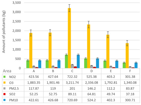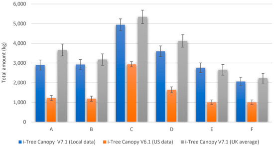 The range of pollutants removed is between 1006.8 ± 120.79 to 2935.18 ± 129.58 kg using i-Tree Canopy Version 6.1 (i.e., calculated using the US average), while i-Tree Canopy Version 7.1 (i.e., using the UK average data) calculated a reduction between 2231.72 ± 249.68 and 5347.27 ± 341.57 kg. More specifically, at the local level, the results yielded a range between 2063.22 ± 221.29 and 4944.86 ± 298.57 kg (Figure 3). Area C recorded the highest removal of pollutants, which is nearly threefold compared to the lowest in area E and F. The difference between the US and the UK average data is more than double.