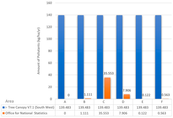 There is a very strong contrast between the results using either tool. Throughout the entire study area, the i-Tree Canopy results recorded a constant value of 139.483 kg/ha/year, while the Office for National Statistics did not record any pollutant removal for area A and near zero for areas B, E, and F. In area C, however, it recorded its highest pollutant removal amount at 35.553 kg/ha/year. Figure 5 shows the amount of each pollutant removed annually using i-Tree Canopy Version 7.1 with local data. Among the five pollutants, O3 had the highest removal amount and NO2 ranged between 301.38 ± 32.34 and 722.32 ± 43.61 kg. In contrast, the Office for National Statics did not estimate any NO2 removal in Areas A and E (Appendix A, Table A1). The Office for National Statistics’ NO2 estimates are significantly lower than those of i-Tree Canopy (i.e., from either version of the software). This outcome can be reasonably interpreted from the EMEP4UK model since, while trees remove NO2 from the atmosphere, natural NO emissions from the soil under trees also exist, and these values balance out to a substantial extent [44]. Our findings are consistent with those of Jones et al. [44] who found that pollutant quantities assessed using the EMEP4UK model are roughly half those found in i-Tree studies. Furthermore, because the Office for National Statistics tool is based on a dynamic model, inhabitants of one area may benefit from pollutants absorbed in neighboring areas due to the nature of the model [43,44]. Additional pilot modeling, outside the purview of this study, can inform possible locations and vegetation parameters to maximize its impact for the least polluted conditions [8]. In the comparison of these results, consideration must be given to the fact that both tools do not consider pollution removal by building integrated vegetation (e.g., green roofs and green walls). In this regard, previous studies have shown that green roofs and green walls are effective to reduce pollution in streets [8]. Green walls, for instance, have been shown to reduce NO2 levels at the street level by up to 40% and PM10 levels by 60%, according to researchers at Lancaster University [61]. It is also acknowledged that the impacts of vegetation on air quality at local scales (e.g., at the street level) are dependent on species composition and can be beneficial or negative. However, both tools were unable to model this level of detail [43,62].