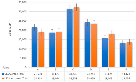 The average monetary value of the Office for National Statistics is GBP 16.19 per person (i.e., the amount saved in healthcare costs) [44]. This result is higher than the UK average of GBP 15.39 per person. The i-Tree Canopy local data recorded a range between GBP 13,457 ± 1444 and GBP 32,252 ± 1948. Figure 6 shows the monetary value using i-Tree Canopy Version 7.1 with the UK average data and local data. There is a difference of GBP 2617 in area A while in area F it is only GBP 336 due to a lower tree canopy. The monetary values calculated using i-Tree Canopy Version 6.1 (i.e., using US average data) ranged from GBP 5486.59 ± 658.25 in area E and GBP 16,009.96 ± 962.99 in area C. However, these figures were estimated using the United States Environmental Protection Agency’s BenMAP, which assesses the incidence of adverse health impacts and related monetary values caused by changes in NO2, O3, PM2.5, and SO2 concentrations [49]. Therefore, urban values were approximated using the national median externality values from the United States [49]. Contrarywise, i-Tree Canopy Version 7.1 as well as i-Tree Eco have been implemented using appropriate official values from the UK [63].