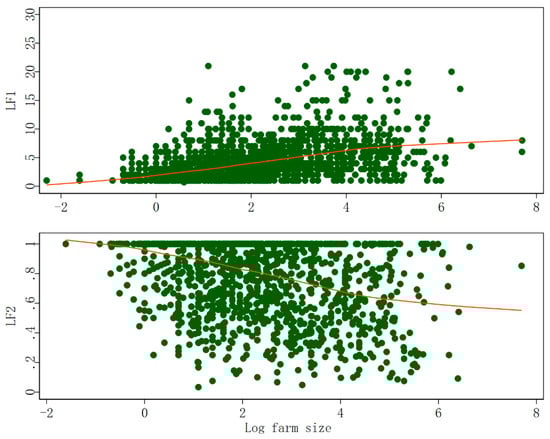 A specific correlation between farm size and productivity was found. Most studies have concluded there is an inverse relationship between farm size and agriculture productivity [48,49,50], even though several scholars have reported a U-shaped relationship [51]. Under this assumption, if there is a correlation between land fragmentation and farm size, a confounding effect in which farmers are allocating inputs due to farm size rather than LF can be considered. Figure 2 shows the data depicts a positive correlation between farm size and LF. Therefore, it was necessary to control the variable of farm size in the regression model, and this estimated result was considered together with the LF variable.