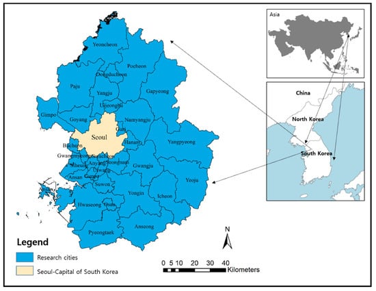 Korea has achieved economic growth at a very high speed since the 1960s. Rapid urbanization and industrialization has particularly progressed around Seoul, the capital of Korea. As the traffic congestion problem in Seoul became severe in the late 1970s, a suburbanization phenomenon involving population movements into Gyeonggi-do, the outskirts of Seoul, quickly emerged to mitigate this problem [,,]. As a result, the capital area including Seoul and Gyeonggi-do formed a typical metropolitan area. About 26 million people, close to half of the Korean population, live in this capital area.