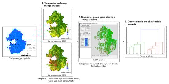 The procedure for conducting the present study is largely divided into three stages (Figure 2). First, an analysis of changes in land coverage for each of the 31 cities was performed based on land cover maps of 1988 and 2018. Second, an MSPA was performed for structural changes in each of the 31 cities. Third, a cluster analysis was performed to grasp the characteristics of each cluster. The detailed study method of each stage is shown below.