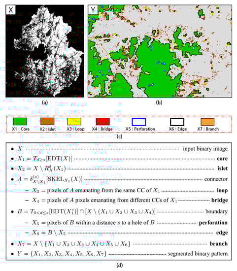 (a) Input binary image of research cities, (b) segmented binary pattern, (c) seven categories of MSPA and (d) equation for each step [].