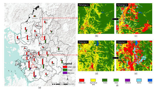 In the case of Namyangju, its land cover types that showed increases in size were found to be urbanized areas, bare land, and waters (Figure 5). On the contrary, its land cover types that showed decreases in size were found to be agricultural areas, forest, grassland, and wetland. In particular, forest areas in Namyangju decreased by about 3900 ha due to urbanization. It was found to be a city showing the second biggest decrease in forest area, following Yongin. In the case of Siheung, its land cover types that showed increases in size were found to be urbanized areas and grassland. On the contrary, its land cover types that showed decreases in size were found to be agricultural areas, forest, wetland, and waters. In particular, its areas of wetland and waters decreased by 1286 ha and 1514 ha, respectively, due to large-scale reclamation projects that appeared in the areas close to the coast. Due to such reclamation projects, wetland and waters were converted to farmland and urbanized areas.