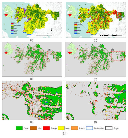 (a) 1988 land cover map of Hwaseong, (b) 2018 land cover map of Hwaseong, (c) 1988 MSPA map of Hwaseong (d) 2018 MSPA map of Hwaseong, (e) detailed view of map (c), (f) detailed view of map (d), and (g) legend of MSPA categories.
