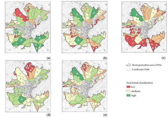 - Method limits: The lack, reliability and updating of some spatial data, in particular regarding recreational areas and infrastructures, land use, scenic landscape components and professional farmers, could be a relevant issue for the development of a knowledge framework and structural interpretation, especially in a peri-urban landscape. The scale of territorial analysis is another issue to be considered. The analysis was conducted at the metropolitan level and at landscape units, merging several data at different original cartographic scales. Combining information at different scales could be a critical point. For the TPA, many data were more detailed than the required scales or than the scale of the new General Territorial Plan of the Turin Metropolitan Area. Regarding spatial classification, the identification of the landscape units does not take into account altimetry and geography (for example hilly or flat areas). In addition, the results of this classification should be updated and verified periodically, according to land use changes. The functional classification and, in particular, the choice of functional categories and map-based indicators, as well as the assignment of weighting coefficients, could be critical points to be tackled. In our opinion, the five typologies are exhaustive for the TPA, but this may not be the case for other areas. To overcome these issues, it would be helpful to select and validate these tools through focus groups and the involvement of policymakers and other stakeholders.