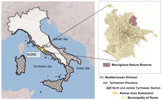 Study area. Ecoregional setting of the Municipality of Rome, from the division to the subsection level (on the left), and location of the Marcigliana Nature Reserve within the Municipality of Rome (on the right).
