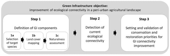 In keeping with the principles proposed for local scale GI planning [28], a multi-step procedure was designed for setting priority measures aimed at enhancing the ecological connectivity in a peri-urban agricultural landscape (Figure 2).
