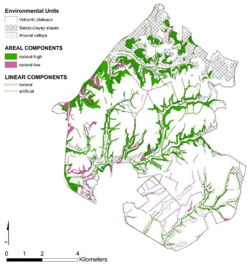 A methodological approach was developed and tested for addressing the improvement of GI connectivity in peri-urban agricultural landscapes. The approach was first based on fine-scale environmental stratification into homogeneous EUNs, each supporting a unique type of PNV. Second, it was based on an in-depth definition of GI components, including linear woody elements, and, third, on the assessment of their naturalness.