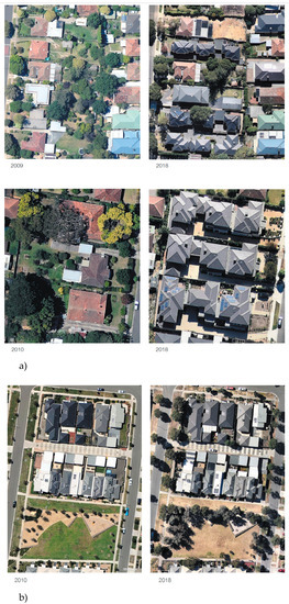 (a) Historic vs. recent growth patterns in established urban areas in Melbourne’s eastern region (upper images: higher residential density and single-dwelling renovation or construction of new dwellings; lower images: a redevelopment of four allotments with four detached dwellings to yield 12 dwellings) and (b) historic vs. current growth patterns in urban growth areas in Melbourne’s northern region (note growth of street trees over an eight-year period). Year of photo under image.