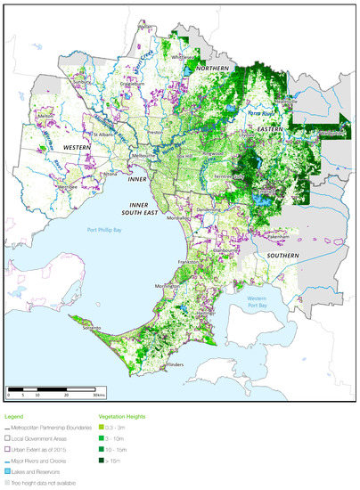 Mapping the extent of the urban forest is essential for its development, protection, maintenance and growth. Comprehensive and accurate maps give government authorities and other land managers the information they need to make informed decisions about improving, re-establishing and connecting natural environments [36]. Canopy cover is an important measure of the urban forest’s ability to benefit the community and the environment [37]. One of the major inhibitors for developing metropolitan-wide strategy was a lack of consistent data across the region. Thus, developing a consistent, metropolitan-wide vegetation and canopy map for the Living Melbourne strategy was a critical step in assessing the current status of metropolitan Melbourne’s urban forest, and for setting future targets and actions [12].