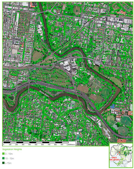 The output provided a map of the distribution and height of vegetation across metropolitan Melbourne (Figure 3 and Figure 4 and further details in [38]). The resultant mapping classified vegetation height into 5 Height Class categories: 1 = 0–0.3 m (grass), 2 = 0.3–3 m (shrub), 3 = 3–10 m (small tree), 4 = 10–15 m (tree), 5 = 15+ m (large trees). In general use, it is recommended that due to (a) the variations in the dates and times of the satellite imagery and LiDAR datasets, (b) the DTM and DSM resolution, and (c) the satellite imagery resolution that the vegetation data are best viewed at a scale of approximately 1:12,000. The overall accuracy of the metropolitan Melbourne urban vegetation height dataset is 82.0%, with Producer’s Accuracy ranging from 74.3% (Height Class 4) to 90.1% (Height Class 1), and User’s Accuracy ranging from 80.0% (Height Class 5) to 85.0% (Height Class 4). When the height classes are condensed down to belonging to Understory Vegetation (<3.0 m) or Tree Canopy (>3.0 m), the Overall Accuracy increases to 94.5%, with Producer’s Accuracy and User’s Accuracy for individual classes above 90%.