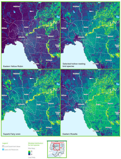 The high suitability of particular riparian corridors (such as along the Yarra River and Dandenong Creek) for many of these bird species highlights the importance of these features for the persistence of some species in the urban landscape, and the importance of connectivity [40,45]. However, for species that are better able to exist in the urban environment, suitable habitat and connectivity is also provided by streetscapes and backyards.