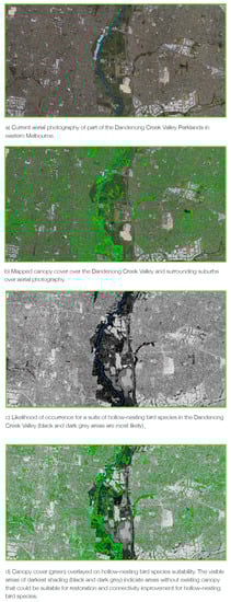 In Melbourne, like in other Australian cities, streetscapes with native trees support significantly more diverse and abundant populations of native birds than streets with mostly exotic trees [41,43]. Birds provide a useful candidate taxon for monitoring as they are relatively easy to detect and identify, census methods are well developed and formal and informal monitoring and databases in existence (e.g., [44]). Using the urban forest canopy cover mapping layer with bird atlas data (supplied by BirdLife Australia) and other important datasets (such as ecological vegetation classes), enabled the modelling of different levels of connectivity and landscape permeability for different bird species and bird groups (Figure 5).