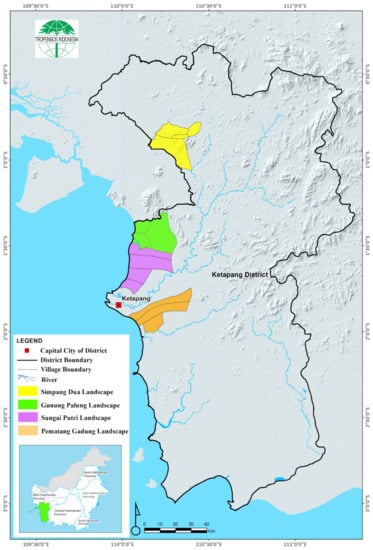 Our case study in Ketapang district focusses on four sub-district landscapes, namely: Simpang Dua, Gunung Palung, Sungai Putri and Pematang Gadung (Figure 1). Each landscape consists of 3–4 villages, and represents characteristics as shown in Table 1.