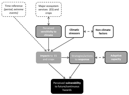 Vulnerability of a socioecological system refers to the propensity or predisposition of that system to be adversely affected. The level of vulnerability is influenced by the adaptive capacity, which is the ability (of systems, institutions, humans and other organisms) to adjust to potential damage, to take advantage of opportunities, or to respond to consequences [42]. More adaptive capacity means that a system is more likely to adjust to changes, and thus decrease its vulnerability. In the context of this study, the system refers to the current combination of people and environment in the communities of the study area. Vulnerability also depends on the system’s sensitivity [40]. Sensitivity reflects the degree to which an existing system is affected by climate variability or change. For example, vulnerability in an agricultural system depends on the sensitivity of crop yields to the changing weather, as well as the ability of farmers to adapt to the circumstances, e.g., by switching crops [43]. Furthermore, the 2014 IPCC report [42] incorporates the concept of risk, which refers to the probability of harm to human life or damages due to climate hazards, and therefore depends on exposure to the hazard, the probability of the hazard to occur, and the vulnerability of the system to that hazard.