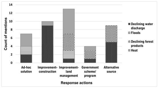 In the ES impact group, dominant response actions in all the landscapes were related to the improvement of forest and land management (Figure 3). This particularly referred to tree planting, either in the forest, in their own farmlands, or around the settlement areas. Participants considered tree-planting as an important action in response to heat, and declining forest products, mainly timber. In addition, this action was also taken to reduce the risk of floods and improve water discharge (Figure 3).