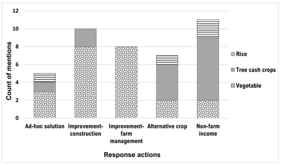 Improving existing constructions was the second most frequent response action, mainly in irrigation systems to address water issues for rice production. Rice farmers also engaged in various improvements in farm management, such as adjusting planting time to the unpredictable start of the rainy season or applying pest and disease control. Planting alternative crops in their own lands, oil palm in particular, is common for tree cash crop farmers. This was most common in landscapes with oil palm plantations in the vicinity, where some villagers worked in those plantations, and where there were markets and infrastructure for selling and processing the fruit bunches.