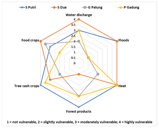 Perceived vulnerability in Pematang Gadung was moderate (average score of 2.8), depending on the impact class. As a peatland-dominant landscape, Pematang Gadung was highly exposed to fire hazards. The perceived vulnerability to heat and to the decline of forest products was mainly attributed to peatland fires that were widespread during dry seasons.