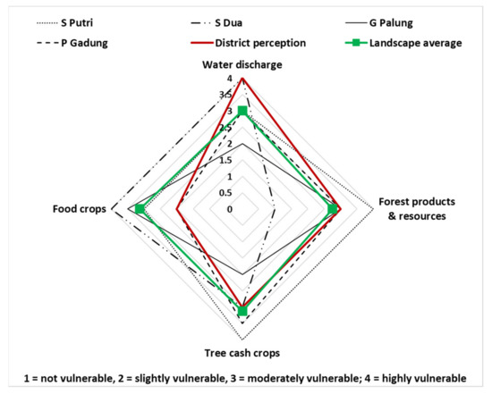 Figure 7 presents the comparison between communities’ perceptions and district stakeholders’ judgments on vulnerability levels related to forest products and resources, water discharge, tree cash crops and food crops (i.e., rice and vegetables).