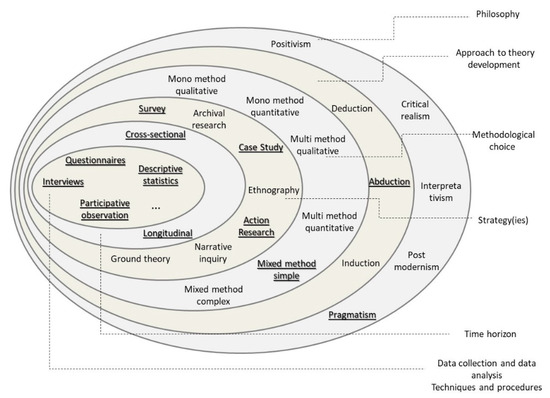 The “research onion” as a reference framework for the design of this research. Source: Adapted from ©2018 Mark Saunders, Philip Lewis and Adrian Thornhill [44].