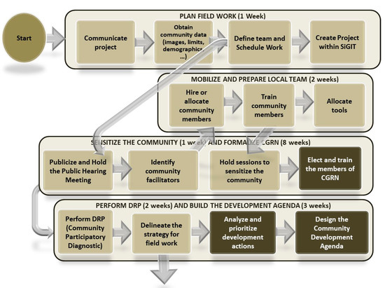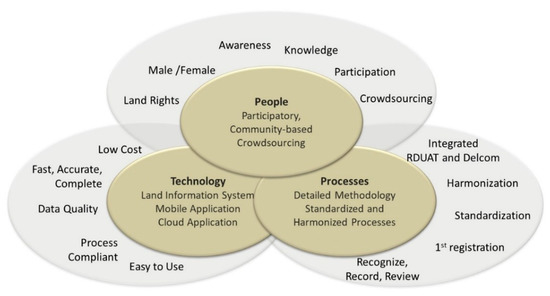 - people or interested parties—to promote knowledge, awareness, and active participation of individuals and communities in the land registration. Apart from the participation of government agencies and services providers, active community engagement was advocated by several studies and frameworks [24,54,56,57,58]. Participatory land-use planning created a higher impact within the communities, increased ownership and satisfaction, and promoted a more sustainable land administration [59]. Crowdsourcing was also an essential approach for first registrations and maintenance of the land cadastres [58,60]. In this research, crowdsourcing was community-based in order to avoid land grabbing.