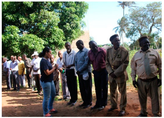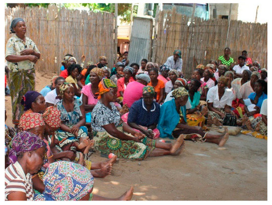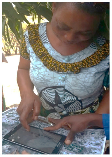 Participation of citizens—Ensure active community participation. The registration process started with a public meeting, with all groups and communities being represented. Together with the local community council, the objectives of the work and the way the work was to be executed were explained to the community. Because women and other vulnerable groups were usually the ones suffering the most insecurity of tenure [8], specific meetings were organized with these segments of the community so that everyone understood that their rights were to be recognized and recorded, following the motto “land rights for all, rich/poor, old/young, male/female” (Figure 3, Figure 4 and Figure 5). Sensitization sessions to promote gender equality and advocate land rights were held throughout the community, utilizing role-play sessions with different scenarios of land tenure inequalities. The training was given to community members selected to be part of the registration teams, including women, the elderly, and young people.