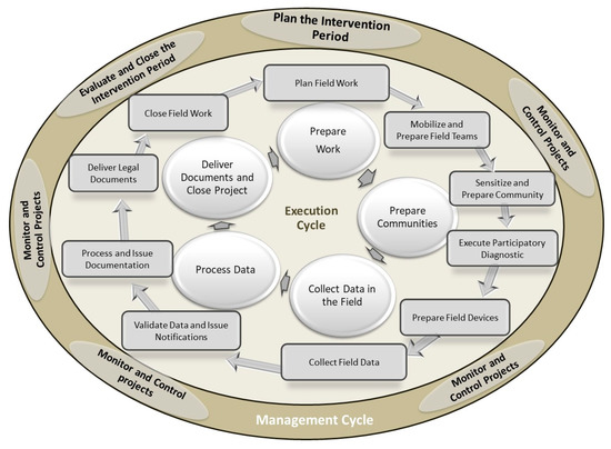 Figure 9. The processes of the FFPLA-MOZ approach. Outer ring: Managerial processes (Plan, Monitor and Control, and Evaluate and Close). Inner ring: Execution processes (Prepare the Field Work, Prepare Communities; Collect Data in the Field, Process Data, Deliver Documents and Close Project). Source: Developed from [37].