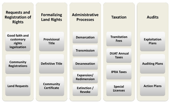 - processes—to implement the rules of the game in a standardized manner. A comprehensive land registration set of processes and procedures, combining both managerial and operational processes (end-to-end), integrating the individual land registration (RDUAT6) and community delimitation (DELCOM7) processes. This was helpful to achieve several benefits, including (i) increased quality of work; (ii) reduction of costs, (iii) reduction of time; and (iv) more accurate and up-to-date information. Processes design respected the key principles of the spatial, legal, and institutional frameworks proposed by Enemark et al. [24].