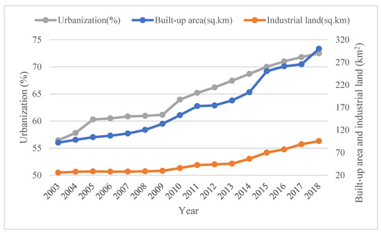 In the past decades, Changzhou experienced rapid urbanization (Figure 2). In 2003, the urbanization rate (the proportion of the urban population) was 56.45%. In 2018, it reached 72.5%. The built-up area also increased rapidly during the period. The built-up area was 92.28 km2 in 2003, and 300 km2 in 2018. There was massive growth in industrial land along with Changzhou’s urban expansion: the industrial land area increased from 25.91 km2 to 95.64 km2 during the study period, with a growth rate of 269.12% (Figure 2).