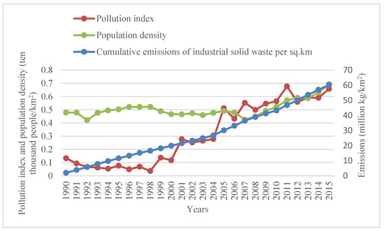 However, Changzhou’s urbanization had a profound effect on the environment. Figure 3 shows that the pollution index—calculated using the linear weighting method based on the three industrial waste sources, namely, waste gas, wastewater, and waste solids—increased from 0.13 to 0.66, indicating that pollution emissions increased greatly from 1990 to 2015 (Figure 3). The cumulative emissions per unit area also increased. In particular, the cumulative emissions of industrial solid waste per km2 increased from 1.94 to 60.23 million kg. As industrial waste emissions were new pollutants produced each year, both cumulative pollution emissions and pollution exposure led to increased health risk. Risk to health increased with more pollutants and pollution exposure. Furthermore, population density increased, although there was a small fluctuation before 2008. Thus, the environment was deteriorating while population increased. In other words, more and more people were exposed to an increasingly polluted environment.