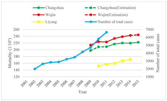 Pollution in Changzhou had conspicuous effects on health. Total mortality was 5.5/103 in 2001, but reached 7.0/103 in 2015. The number of cases and mortality from cancer increased markedly in the past decades in Changzhou according to the data gathered from published literature. The number of inpatient cases of cancer in Changzhou was 1995 in 2002, and reached 6649 in 2011 (Figure 4). The mortality from cancer in Changzhou was 208.98/105 in 2011 and increased to 222.08/105 in 2015 [33]. Mortality was 214/105 in Wujin district in 2009 and increased to 242.6/105 in 2014 [36]. This was higher than the mortality in the whole city. The mortality from cancer in Liyang county was the lowest, although it increased from 151.88/105 in 2010 to 171.4/105 in 2014 [37].