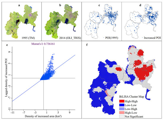 Spatial evolution of construction land and high-polluting industries from 1995 to 2014: (a,b) is remote-sensing image in 1995 and 2014 respectively; (c,d) is POI of high-polluting enterprise in 1995 and 2014 respectively; (e,f) is Mora’s I scatter plot and LISA cluster map respectiavely.